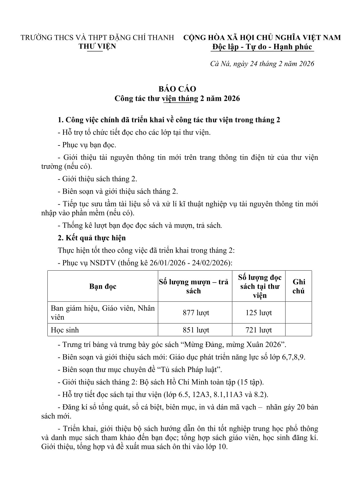 Báo cáo công tác Thư viện tháng 2 năm 2026