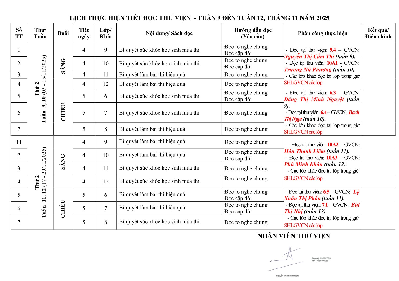 Lịch thực hiện tiết đọc sách tháng 11 năm 2025