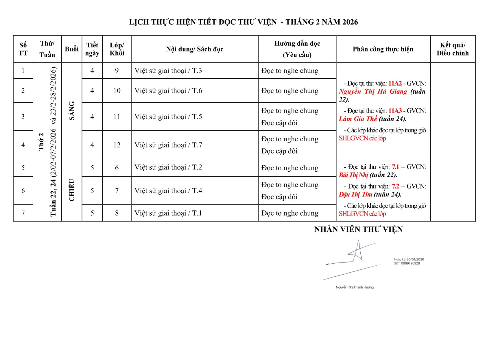 Lịch thực hiện tiết đọc thư viện, thháng 2 năm 2026